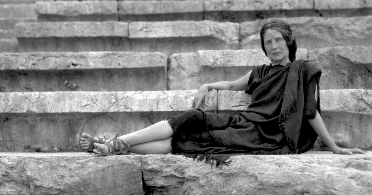 Eva on the steps of the Theatre at Delphi, Benaki Museum Full size 1200 × 630 pixels THE PEACE WEAVER Eva Palmer Sikelianos Eva on the steps of the amphitheatre at DelphiBenaki Museum Previous image Next image